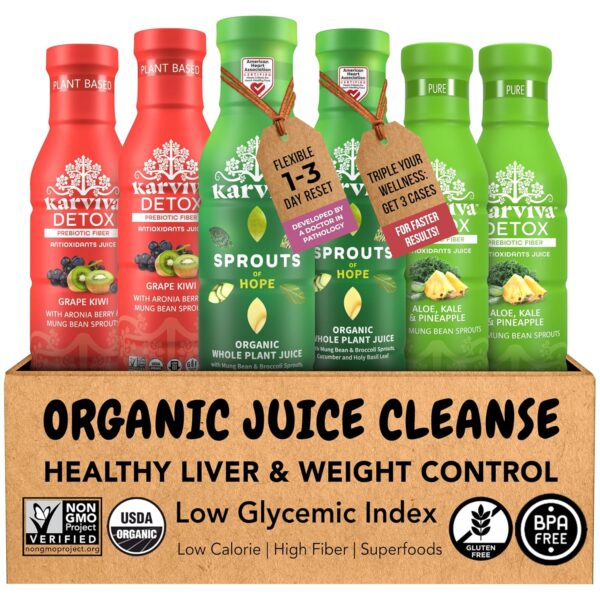 - Perfect for a Gentle Cleanse: This 6-bottle pack includes 2 bottles each of Detox (aronia berry, bean sprouts, grape, kiwi), Pure (aloe, kale, bean sprouts, pineapple), and Sprouts of Hope (broccoli sprouts, bean sprouts, cucumber, ginger, and holy basil). Together, these juices offer a gentle cleanse to refresh your system without harsh additives or unsafe practices.